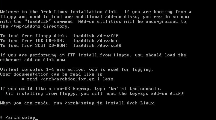 Taper "/arch/setup" en valider avec la touche "Entrée". Attention le clavier est en QWERTY.